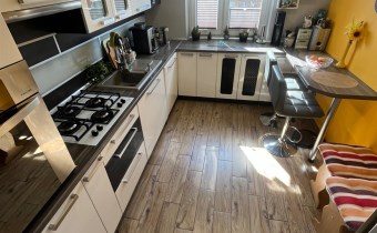 W kuchni pozostają meble kuchenne zrobione na wymiar, zmywarka, płyta gazowa, piekarnik.